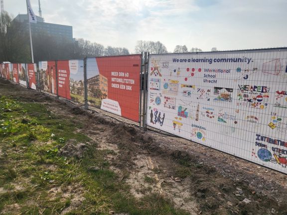 The banner is displayed on the fence surrounding the building site. If you are curious, why not plan a bike ride to Cambridgelaan 101 to see for yourself what a great job these students did.