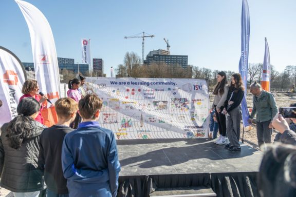 Instead of having several speeches, Ms Marieke Folkers, our Head of School conducted short interviews with all stakeholders present. Luca (student Grade 6) was brave enough to stand on the podium and tell us what he most looks forward to in the new building. "More space to play football." PHE teacher Mr Jeroen Lamme, couldn't agree more. He looks forward to having our own playing fields and gyms, but also to be able to utilise the existing sports facilities at Utrecht Science Park at Olympus and the nearby Kromme Rijn swimming pool.
