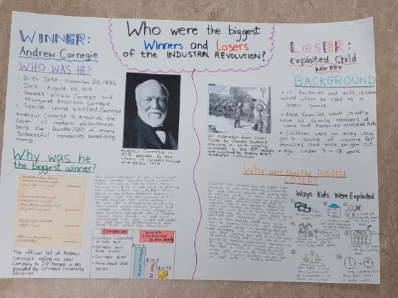 In grade 9, the students recently completed an assignment in which they had to select a ‘winner’ and ‘loser’ of the Industrial Revolution and create a poster and present their findings to the class. Not only did the grade 9's have strong arguments that were supported with reliable evidence, but their posters were visually stunning too!