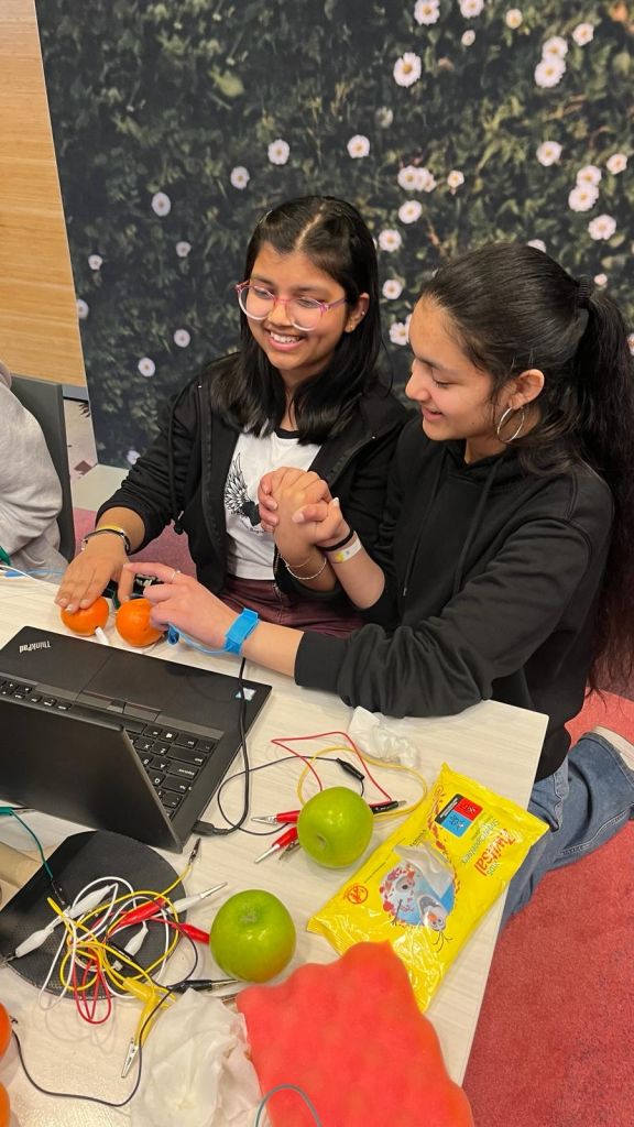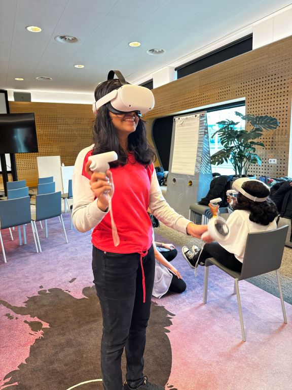 After other stations where one group played a fruit game and the other a game wearing VR glasses we had time to eat our lunch. After lunch we divided ourselves into smaller group and we started talking to 2 women working with apps. We learned a lot about cyber security in apps and how specific testers test the app to see if it’s good and safe before putting it in the App Store. We were told that very few women work in this field and they would like more young women to join them.