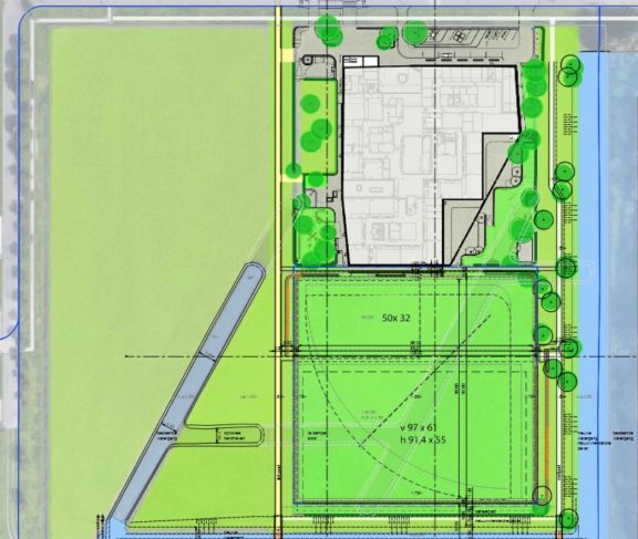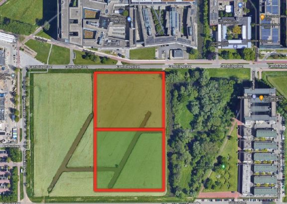On the left you see a picture of the building plot at the Cambridgelaan, next door to the new RIVM building and across the street from Hogeschool Utrecht. In the drawing on the right you can see how the building and playing fields will fit on the plot.